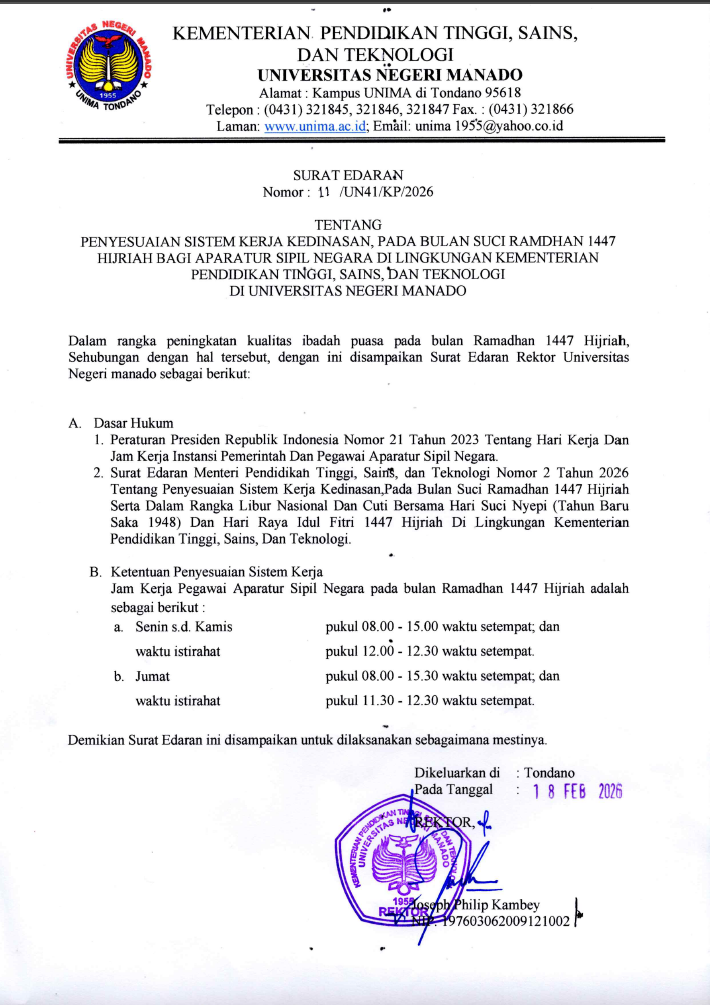 Dalam rangka peningkatan kualitas ibadah puasa pada bulan Ramadhan 1447 Hijriah, maka dilaksanakan penyesuaian Jam Kerja Pegawai Aparatur Sipil Negara di lingkungan Unima, dalam hal ini Fakultas Bahasa dan Seni yang dapat dilihat pada surat berikut.