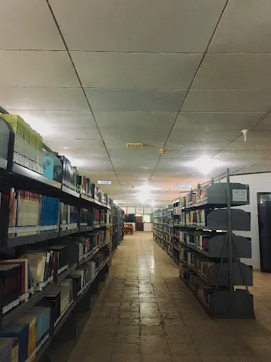 Perpustakaan modern dengan ribuan koleksi buku dan jurnal digital.x
